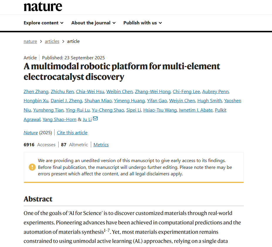 On September 23, 2025, Zhang Zhen (Class of 2021) and Ren Zhichu (class of 2018), Chemistry graduates of Zhiyuan College, have had published a research paper titled "A multimodal robotic platform for multi-element electrocatalyst discovery" as co-first authors in the top international academic journal Nature. This work has developed a new type of intelligent platform named "CRESt (Copilot for Real-world Experimental Scientists)", which combines multimodal large models with high-throughput automated experiments. By integrating human experiences, literature knowledge and microstructure information, the research and development efficiency of catalysts has been significantly enhanced.